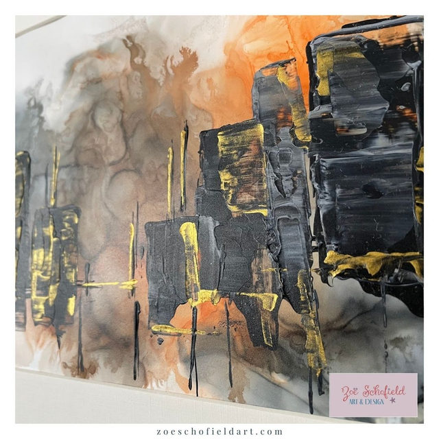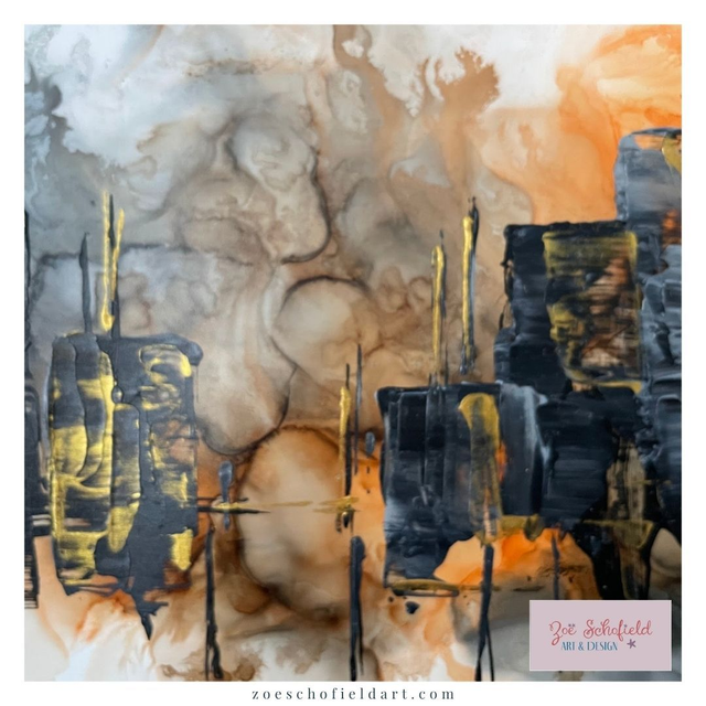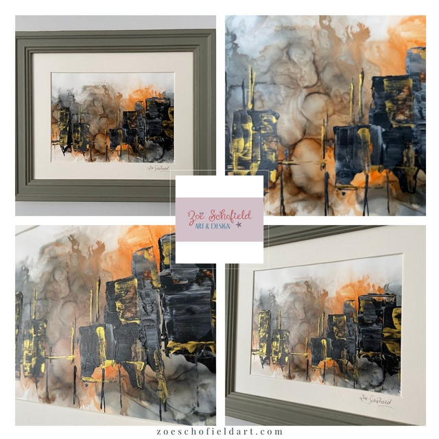 Warm and moody city nights in this abstract city skyline at sunset reflected in the harbour waters below. This thought-provoking original mixed media piece uses alcohol inks with acrylics and metallics.