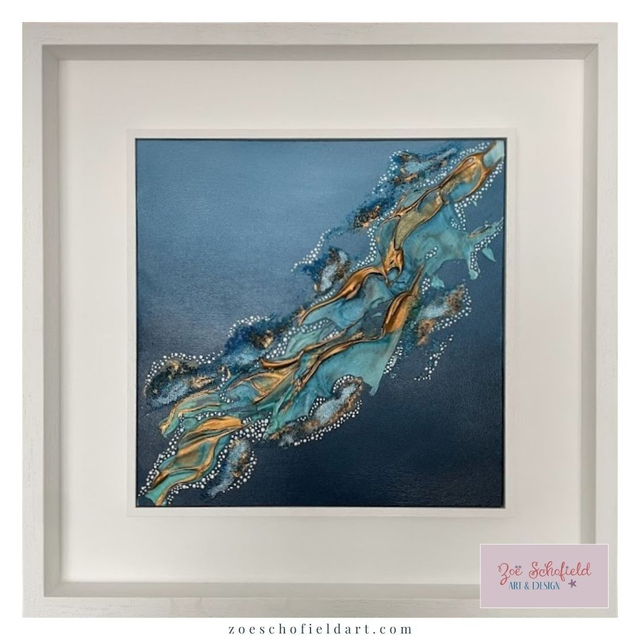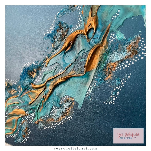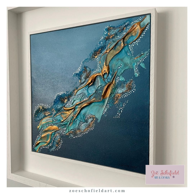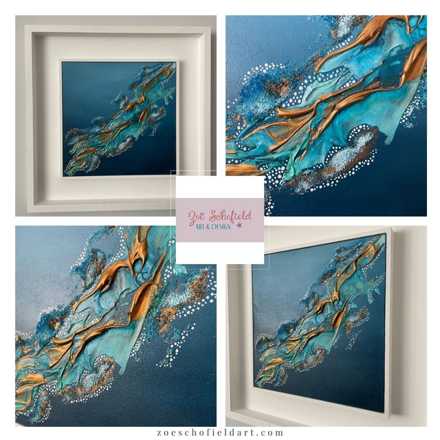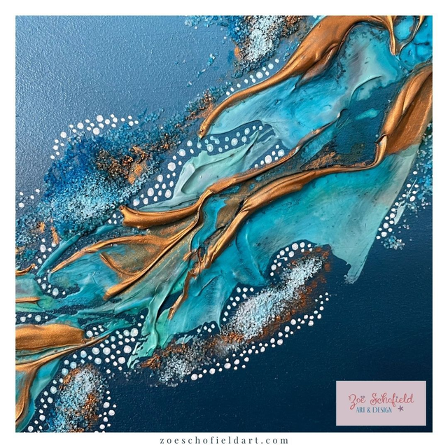 A stunning abstract piece using acrylic paints, texture past, alcohol inks and metallics. Capturing your gaze and taking you to the shimmering reef waters with beautiful turquoise and teal blues, with copper accents.