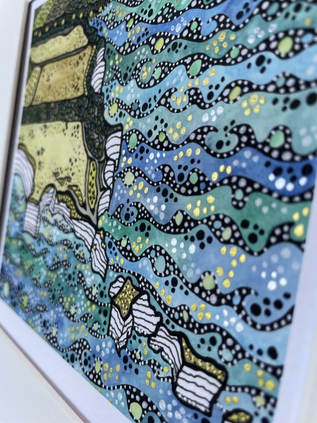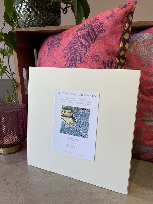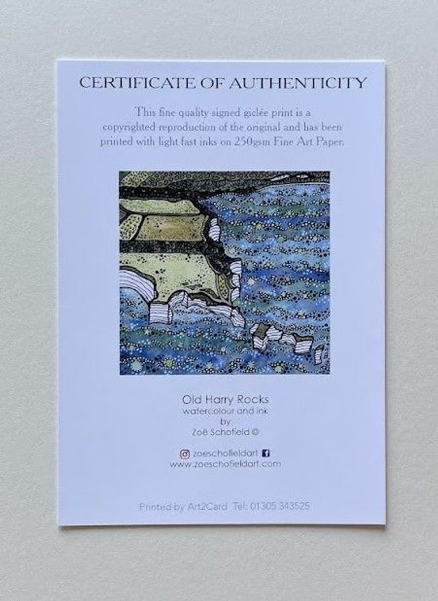 Details: A beautiful signed fine art print of the artist's original watercolour and ink artwork, capturing the dramatic Old Harry Rocks on the Purbeck coastline in Dorset.