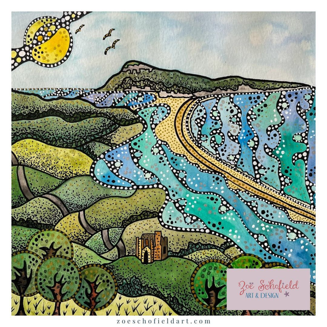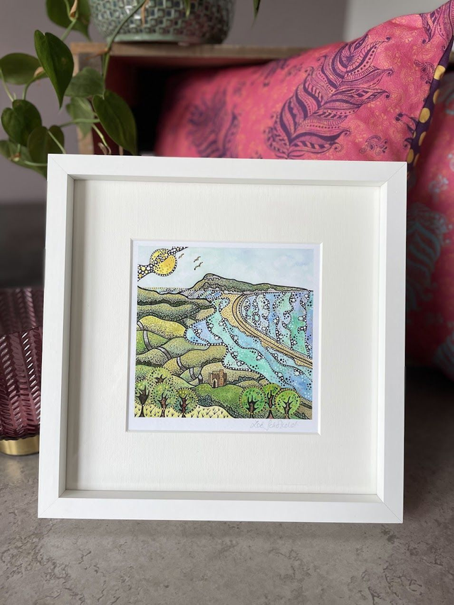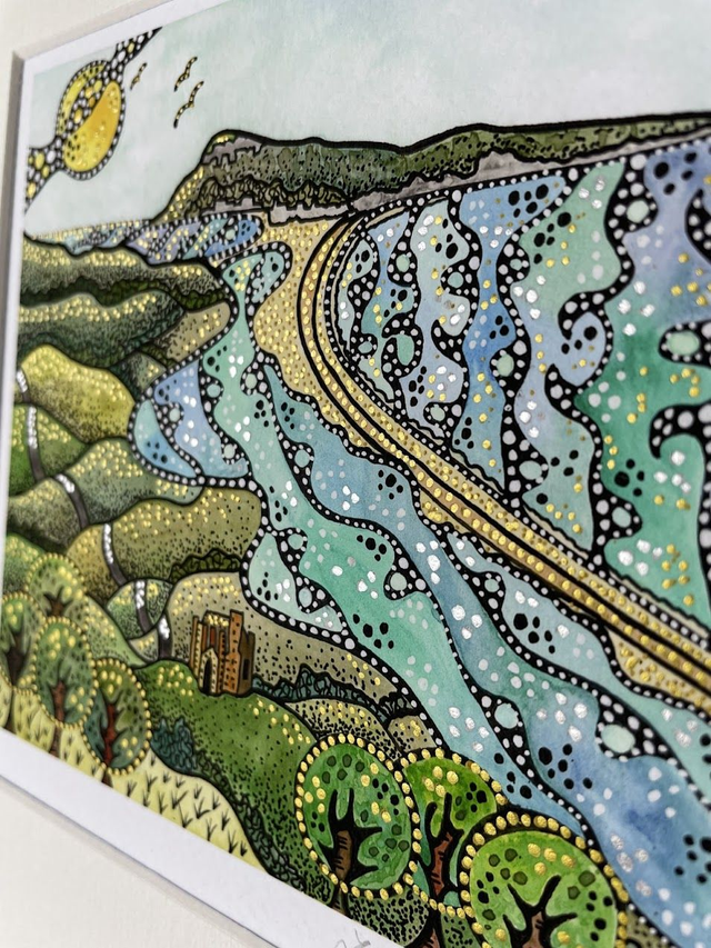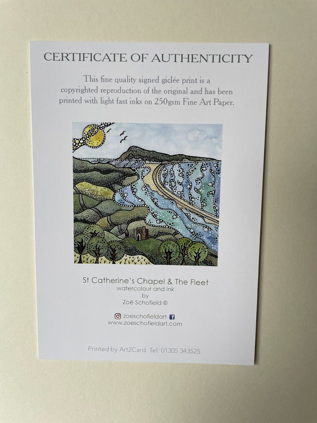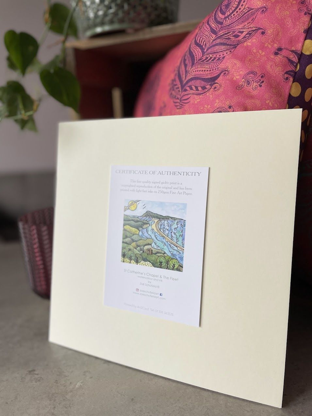 Details: A beautiful signed fine art print of the artist's original watercolour and ink artwork, capturing the iconic St Catherine's Chapel as it looks over The Fleet with Chesil Beach in the distance. Another wonderful location on the stunning Jurassic Coast of Dorset. Each print is hand finished with eye catching metallic highlights.