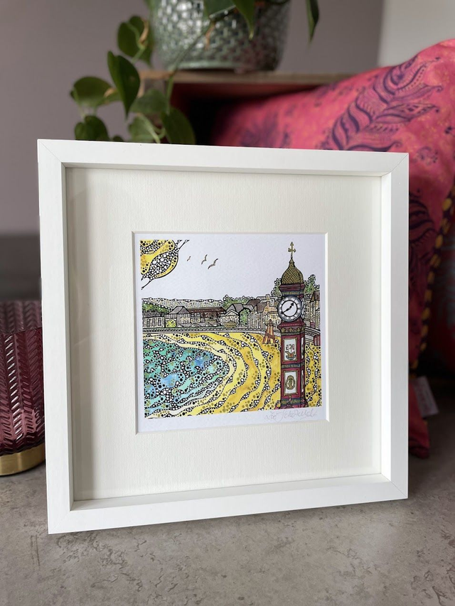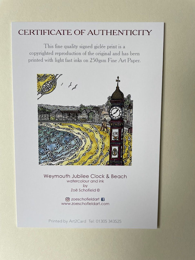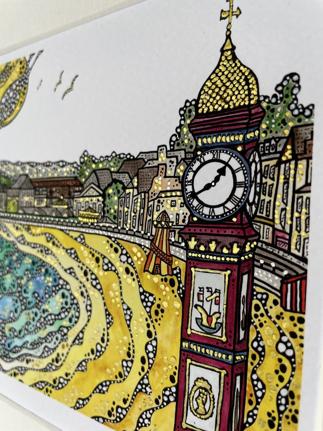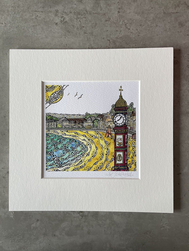 Details: A beautiful signed fine art print of the artist's original watercolour and ink artwork, capturing the wonderful Weymouth Jubilee Clock and beach on the stunning Jurassic Coast of Dorset. Each print is hand finished with eye catching metallic highlights.